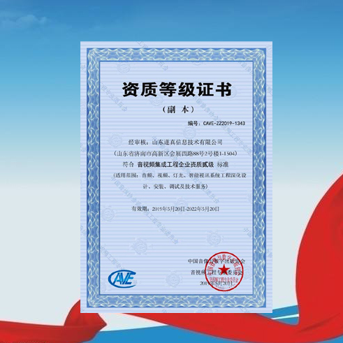 公司獲得中國音像協(xié)會音視頻工程專業(yè)委員會頒發(fā)的《音視頻集成工程企業(yè)資質(zhì)貳級》證書,成為省內(nèi)首批通過該權(quán)威機構(gòu)認(rèn)證的二級資質(zhì)企業(yè)。